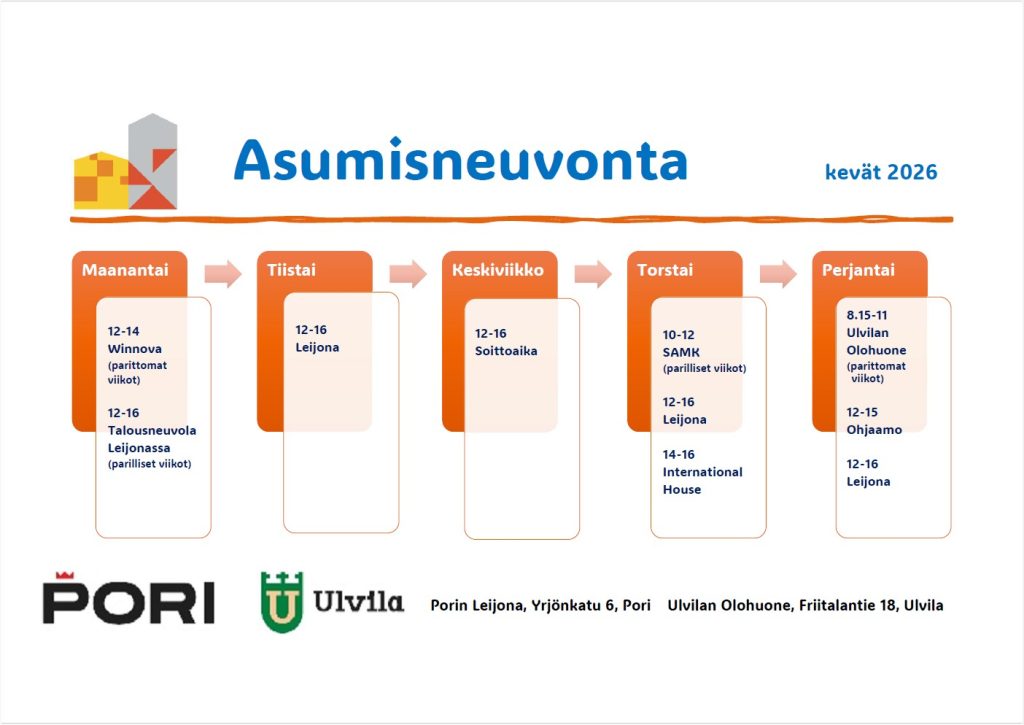 Voit tulla asumisneuvontaan ilman ajanvarausta Porin Leijonaan tiistaisin, torstaisin tai perjantaisin klo 12-16.