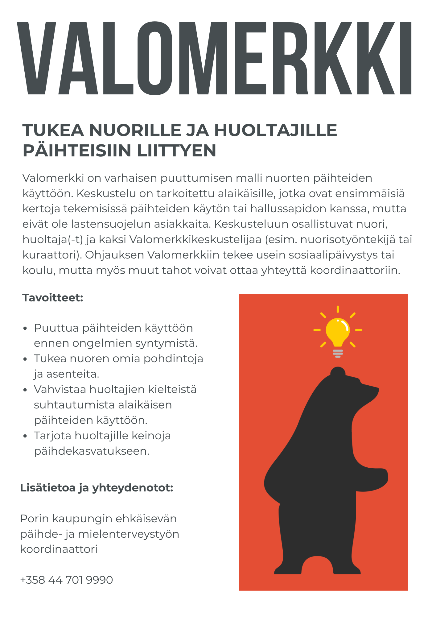 Koordinaattoriin voi olla yhteydessä esimerkiksi yhteistyöhön, kaupungin päihdetilanteeseen, kehittämisideoihin tai muihin ajankohtaisiin ehkäisevään työhön liittyviin tarpeisiin liittyen.