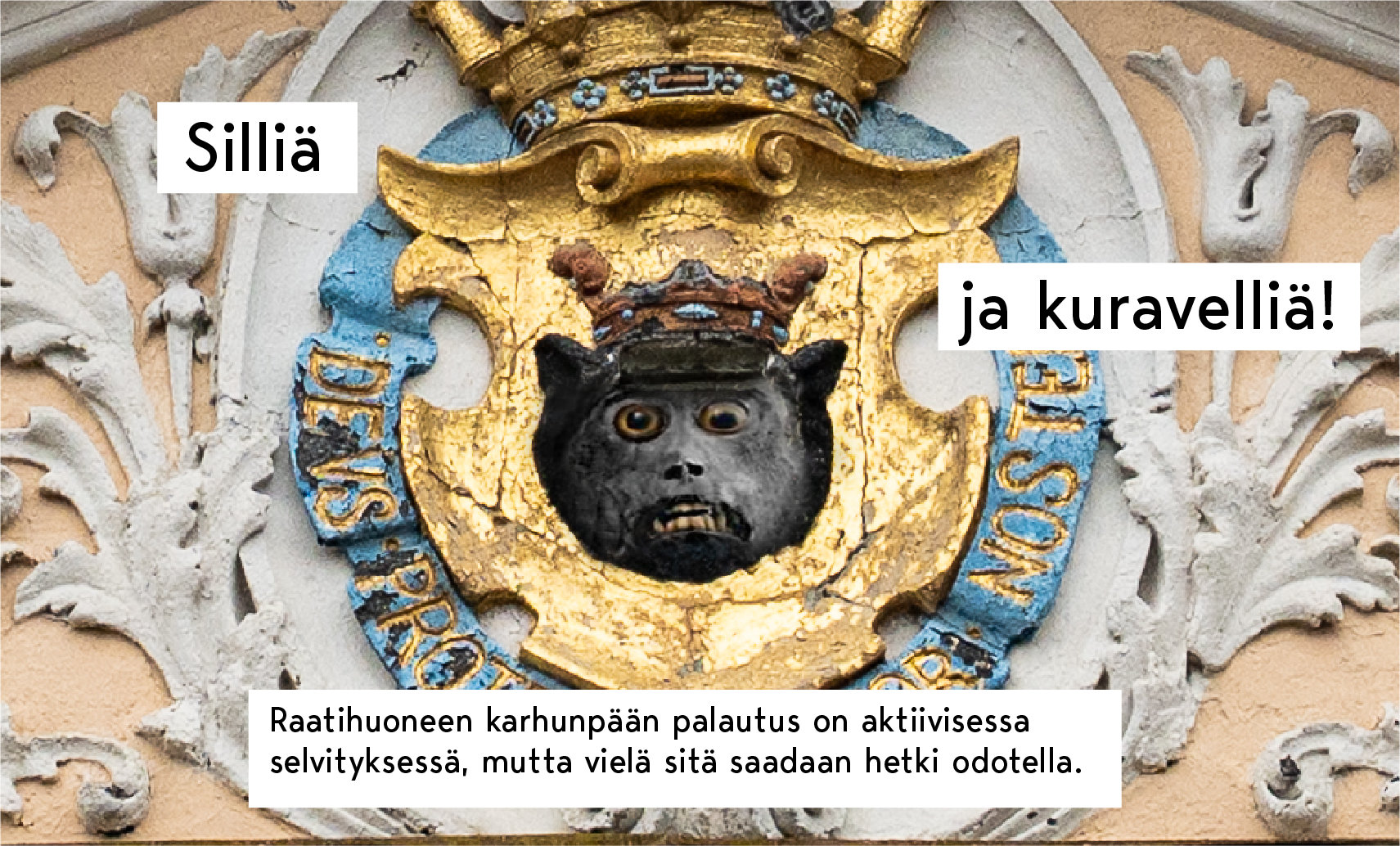 – Empiretyylisessä raatihuoneessa pientenkin yksityiskohtien merkitys ja vaaliminen korostuu. 1840-luvulla valmistuneen raatihuoneen alkuperäinen suunnittelija Carl Ludvig Engel sekä tornin suunnittelut arkkitehti J.E. Stenberg hyväksyisivät varmasti nykyisen karhunpään. Tätä kannattaa tulla sankoin joukoin ihailemaan, kannustaa Joukio.