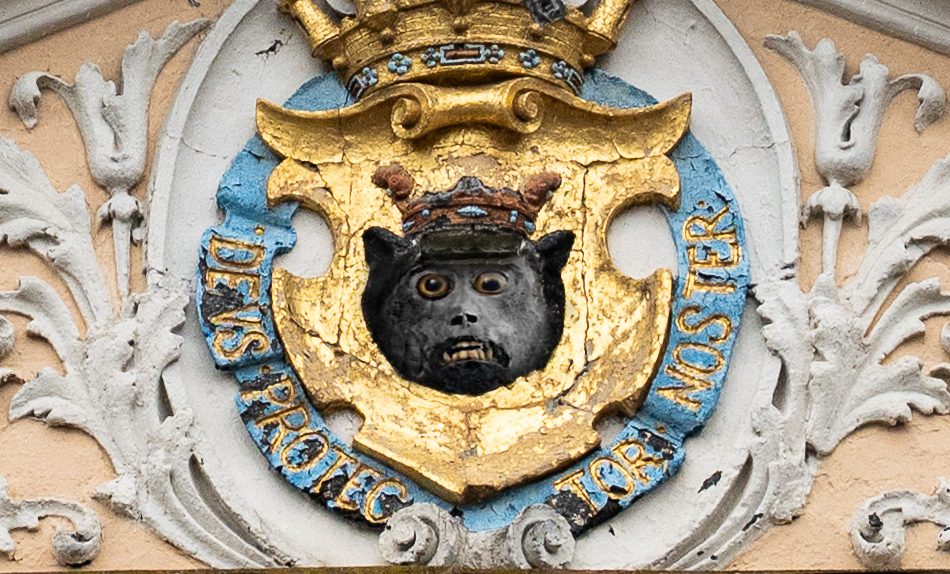 Uudistettu karhunpää näkyy selkeästi kadulle asti. Sen ääriviivat erottuvat vaakunasta aiempaa tarkemmin.