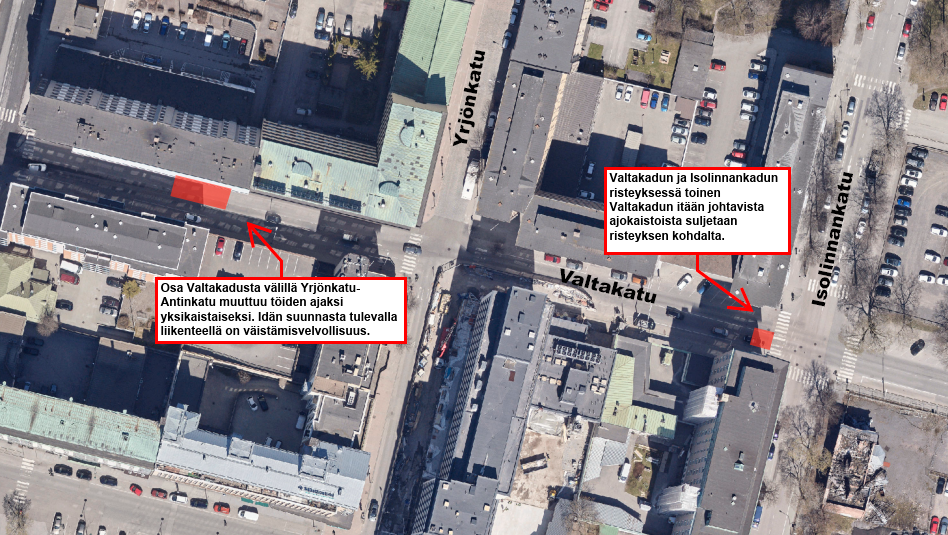 Keskiviikkona 25. maaliskuuta työt jatkuvat Valtakadun ja Isolinnankadun risteyksessä siten, että toinen Valtakadun itään johtavista ajokaistoista on risteyksen kohdalla suljettuna.