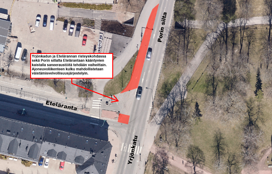 Yrjönkadun ja Etelärannan risteyskohdassa sekä Porin sillalta Etelärantaan kääntyvien kaistalla töitä tehdään tiistaina 24. maaliskuuta vaiheittain. Ajoneuvoliikenteen kulku mahdollistetaan töiden aikana väistämisvelvollisuusjärjestelyin. Jalankulkijat ja pyöräilijät pääsevät kulkemaan risteyksestä normaalisti.