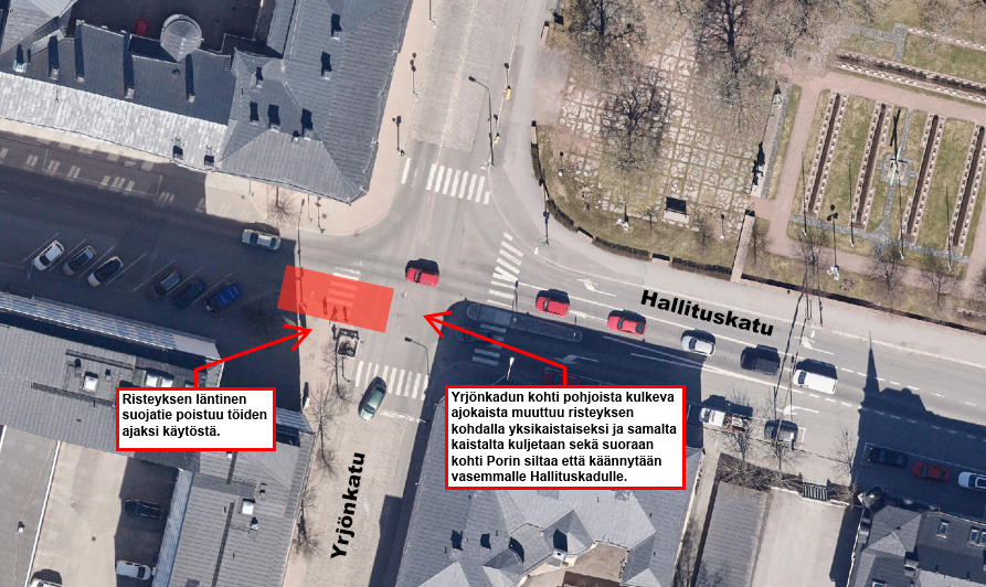 Tiistaina 24. maaliskuuta noin kello 8–20 saneeraustöitä tehdään Yrjönkadun ja Hallituskadun risteyksessä. Yrjönkadun kohti pohjoista kulkeva ajokaista muuttuu risteyksen kohdalla yksikaistaiseksi ja samalta kaistalta kuljetaan sekä suoraan että käännytään vasemmalle Hallituskadulle. Risteyksen läntinen suojatie poistuu töiden ajaksi käytöstä.